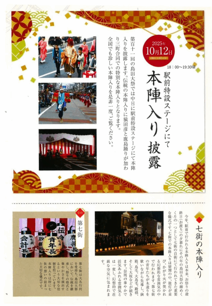第111回島田大祭では中日(10月12日)に島田駅前(北口)特設ステージにて本陣入りを披露します。伝統の本陣入りに猿田彦と鹿島踊りが加わり三町合同での特別な本陣入りとなります。