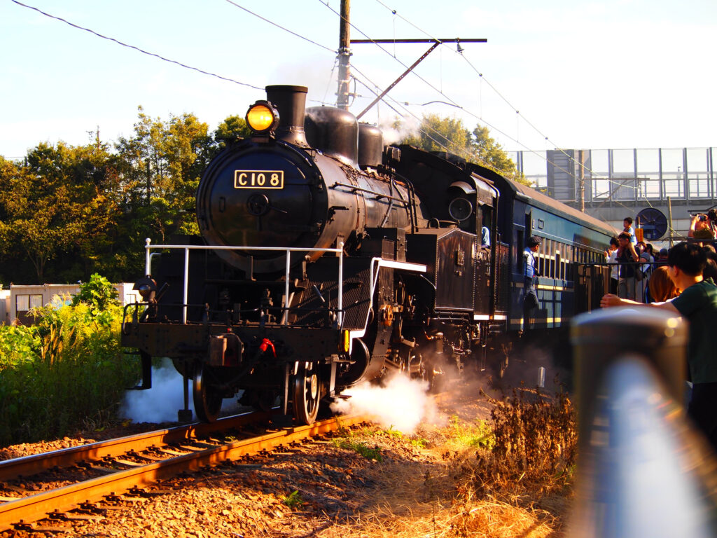 夕方と大勢の人に見送られながら走るSLの疾走感あふれる1枚です。