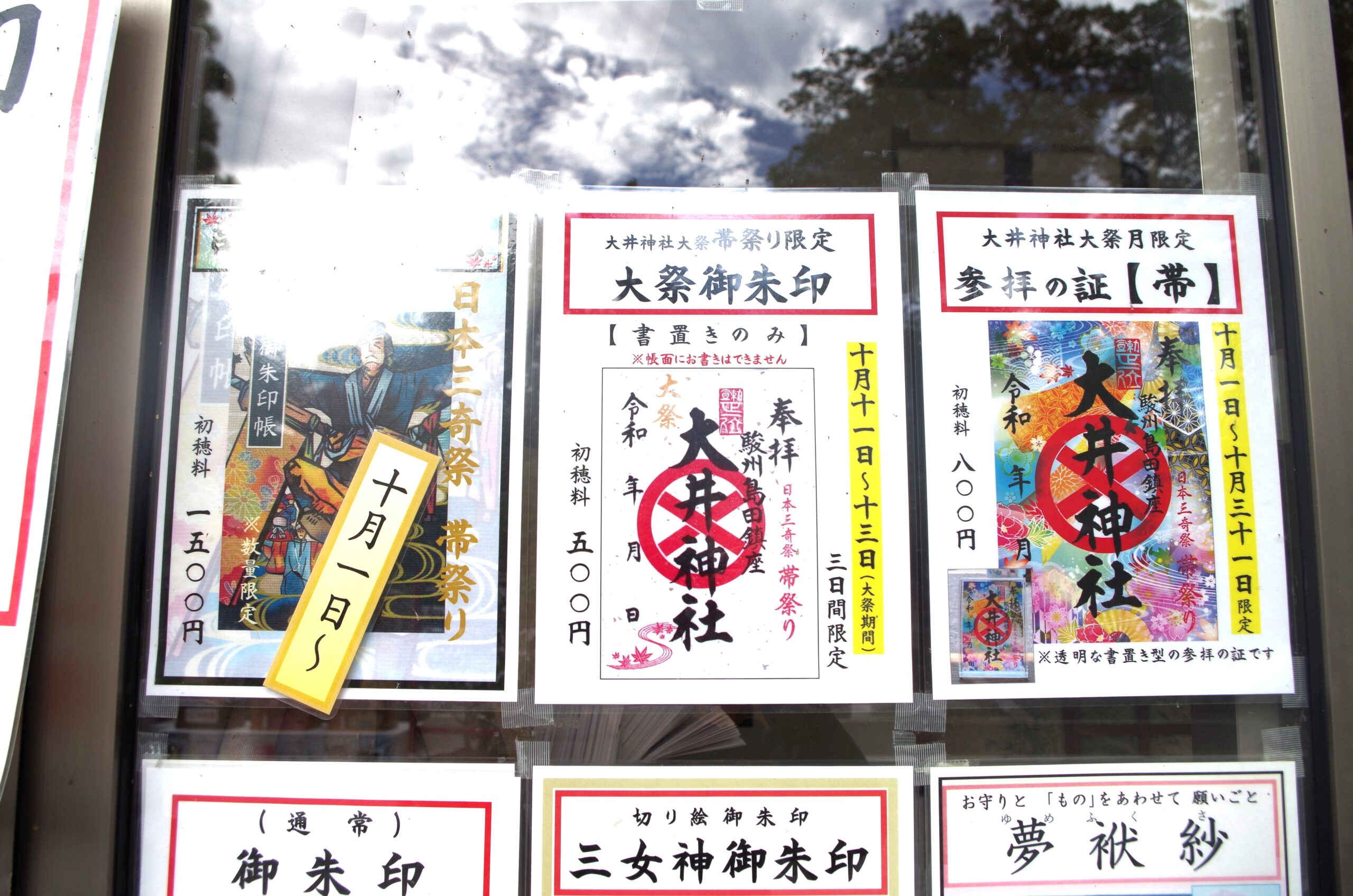 大祭期間中(10月11日〜13日)の3日間限定で「大祭御朱印」を受けることができます。三年に一度しか受け取ることができない為大変人気です。通常のものとは違う十月だけの「参拝の証【帯】」は透明な書置き型の参拝の証は、飾って楽しめるデザインです。