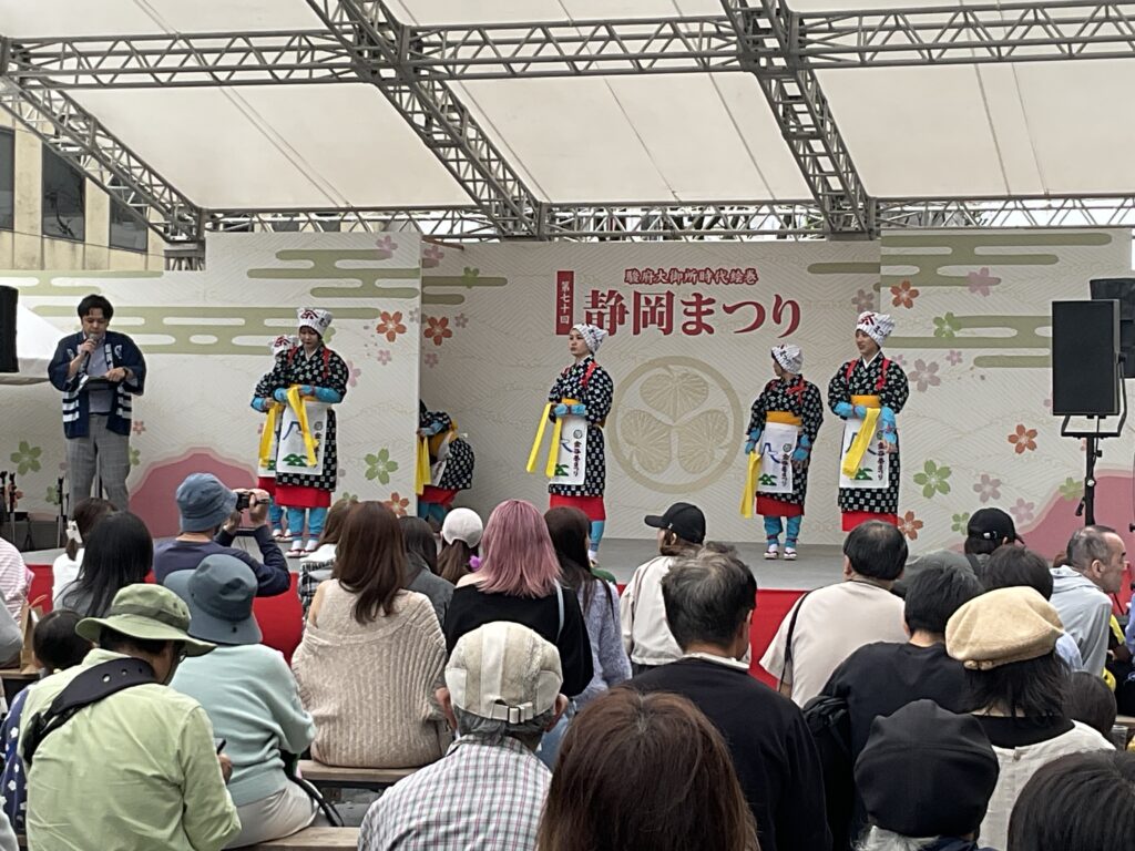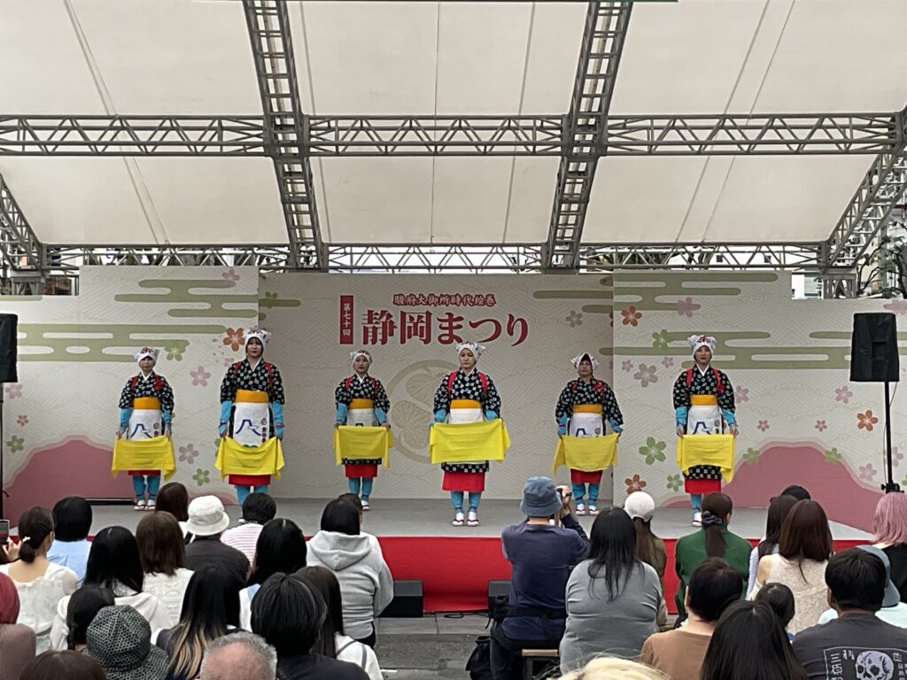 今回は6名がステージにて、「茶まつり囃子」「ちゃっきり節」「金谷音頭」「茶娘おどり」「牧之原音頭」全5曲をしなやかに踊りました。大勢の観客に見守られ、無事に踊り終えました。
